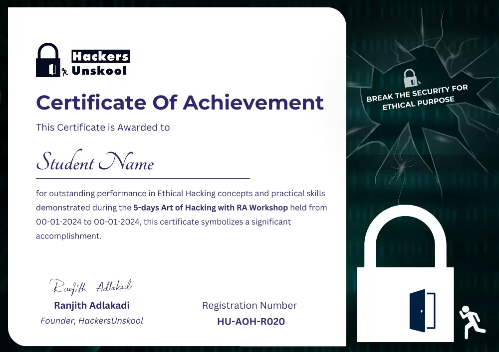 EXCELLENT Based on 252 reviews Posted on subrahmanyam GovinduTrustindex verifies that the original source of the review is Google. It's amazing experience and very good opportunity to gain a knowledge about hacking... In future we are eagerly waiting for more sessions to get more stuff about Ethical hacking.these 5days workshop is very useful to us.... thankyou for such a great workshopPosted on Dhanasekaran KannanTrustindex verifies that the original source of the review is Google. Thank you for teach this opportunity I learned more and good teacher how to product my self I learn more , good worth payPosted on Vamsi PallaTrustindex verifies that the original source of the review is Google. The 5-Day Art of Hacking with RA workshop was an exciting and usefull experience. It provided to real-world hacking techniques in a structured and beginner-friendly manner.Posted on sai krishnaTrustindex verifies that the original source of the review is Google. I had a great learning experience in the 5-Day Art of Hacking with RA workshop. The sessions were very clear and easy to understand. RA explained each topic step by step and gave real-life examples. We also learned about many tools used in ethical hacking. Even difficult topics became simple because of the way RA taught us. This workshop is perfect for beginners who want to start their journey in cybersecurity. I really enjoyed it and will recommend it to others.Posted on UnanimousTrustindex verifies that the original source of the review is Google. I recently attended a 5-days art of hacking with RA, and it was an excellent experience. The sessions were highly practical, and the instructors focused on hands-on learning rather than just theory. I was surprised by how much was covered in just 5 days, especially at such an affordable price. It’s a great opportunity for anyone looking to gain real-world skills in ethical hacking. Highly recommended!Posted on Ranjith KumarTrustindex verifies that the original source of the review is Google. I recently had the opportunity to attend the 5-day Art of Hacking course, and it was truly an eye-opening and empowering experience. Whether you’re a beginner in cybersecurity or someone looking to sharpen your ethical hacking skills, this course delivers immense value in a short time. This wasn’t just theory. The live demos, CTF (Capture the Flag) challenges, and practical sessions made the learning highly interactive. The trainer Ranjith Adlakadi had deep technical knowledge and real-world experience. Their ability to explain topics and tools with clarity and enthusiasm was impressive. And also extremely supportive during Q&A sessions.. The course provided excellent study material, cheat sheets, toolkits, and access to a sandbox environment to continue practicing even after the training ended.. The Art of Hacking 5-day course is an absolute must for anyone serious about cybersecurity. It equips you with the tools, mindset, and skills to understand how hackers think — and more importantly, how to defend against them. I walked away more confident, more curious, and inspired to dive even deeper into the ethical hacking world. Highly recommended for IT professionals, cybersecurity enthusiasts, and anyone passionate about digital defense.Posted on sri charanTrustindex verifies that the original source of the review is Google. Very insightful and useful one which is not at all available in the internet out there where explanation and reasoning for each every concept in detail. Hands on was something you should definitely try to make with more worthPosted on Maridimamba TravelsTrustindex verifies that the original source of the review is Google. Just finished an incredible 5-day journey into the "Art of Hacking" at HackersUnskool with Ranjith Adlakadi! Each day was packed with hands-on learning, real-world scenarios, and eye-opening insights into cybersecurity. Ranjith's teaching style made complex topics easy to understand and engaging. If you're curious about ethical hacking or want to build a strong foundation in cybersecurity, I highly recommend this workshop!Posted on Praveen KumarTrustindex verifies that the original source of the review is Google. It’s a very good ethical hacking session i just came to know how to protect our data from hackers.. Mr.ranjith nailed it in clear explanation I will practice with tools in future..Tq..for ur love and support for us ❤️😊